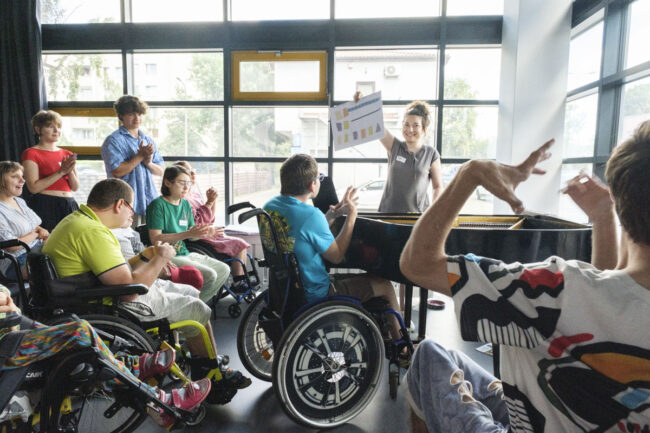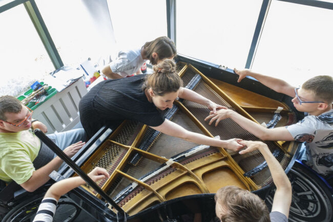 Podczas 4 dni zajęć poznawali oni swoje preferencje estetyczne, próbowali stworzyć kompozycje w różnych technikach, próbowali swoich sił jako pianiści, tworzyli prace do słuchanej muzyki (współczesnej, klasycznej, rozrywkowej), poznawali techniki rozszerzone gry na fortepianie, szukali symboli, odpowiedniego koloru lub materiału do kolażu. Pracowaliśmy też z fragmentami obrazów, nut i zdjęć, które wybieraliśmy do odpowiednich utworów. Wszystkie te ćwiczenia służył temu, aby na końcu stworzyć pracę wyobrażoną i wysłyszaną w swojej wyobraźni. Bardzo ważnym elementem tych ćwiczeń było też poznawanie uczestników – część z nich komunikowała się za pomocą komunikacji alternatywnej i wspomagającej PCS, dlatego niezwykle ważne dla nas było, żeby mieć pewność, iż prace które chcą stworzyć, są takie jakich pragnęli.